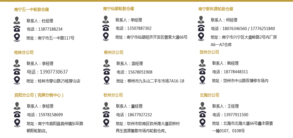 本公司是廣西區(qū)內(nèi)的輪胎批發(fā)及零售商,獨家代理世界及國內(nèi)眾多知名品牌輪胎:德國大陸馬牌輪胎(世界第四品牌),美國庫珀輪胎(世界第八品牌)杭州中策朝陽(中國第一品牌),杭州中策好運(中國第二品牌),無錫紅豆、赤兔馬、千里馬,等品牌。在廣西區(qū)內(nèi)有眾多集團客戶,主要為中國鋁業(yè)股份有限公司平果分公司、廣西晟宇通物流有限公司、南寧市平樂行物流有限公司、柳州恒達巴士股份有限公司、廣西欽州國際集裝箱碼頭有限公司、廣西盛達混凝土有限公司、火車站物流車隊、區(qū)內(nèi)部分快運車隊等的輪胎專用供應商。多年以來,被南寧市工商局授予“誠信?維權承諾單位”、“消費者信得過單位”以及“南寧市第一次全國經(jīng)濟普查先進集體單位”。